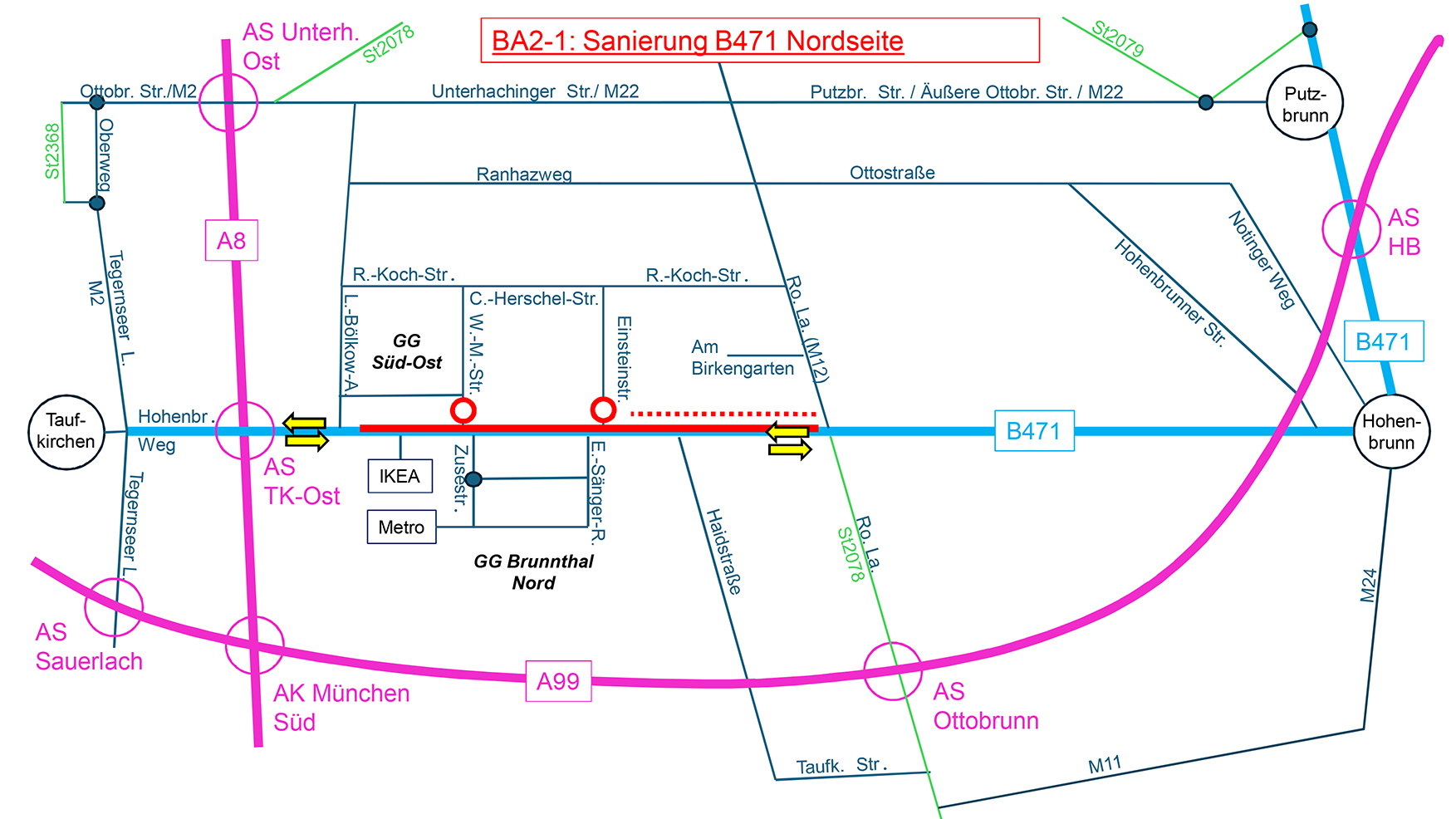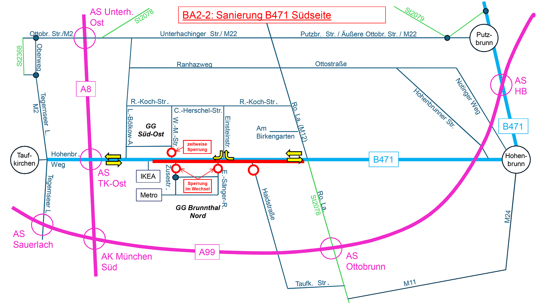 In Bauabschnitt 2 ab voraussichtlich 26.9. erfolgt die Sanierung auf der Südseite unter Sperrung der Haidstraße sowie einer wechselweisen Sperrung der Zusestraße bzw. des Eugen-Sänger-Rings. Das Gewerbegebiet Brunnthal Nord auf der Südseite der B 471 ist somit entweder über die Zusestraße oder den Eugen-Sänger-Ring zu erreichen. Die Zufahrt zu IKEA bleibt in diesem Abschnitt weiterhin offen.