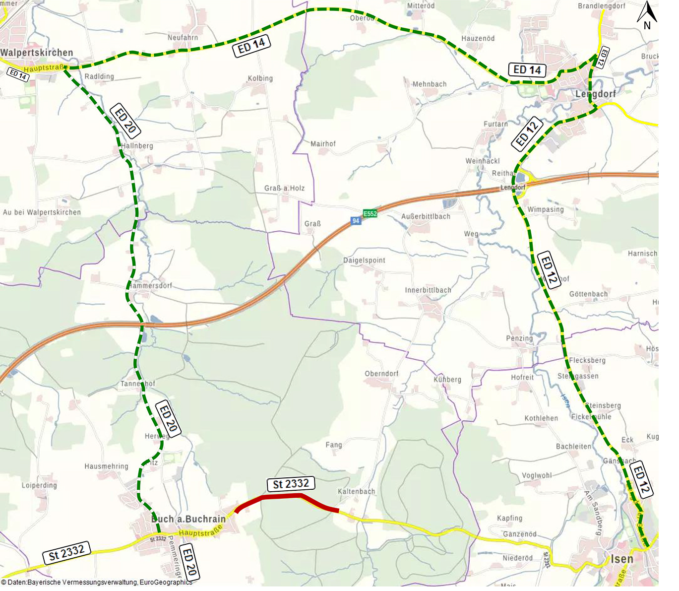 Umleitungsbeschreibung: Der überörtliche Verkehr wird in Buch am Buchrain über die ED 20 (Erdinger Straße) nach Walpertskirchen zur ED 14 (Hauptstraße), auf der ED 14 zur ED 12 bei Lengdorf und weiter auf der ED 12 nach Isen geleitet. Die Gegenrichtung erfolgt analog.