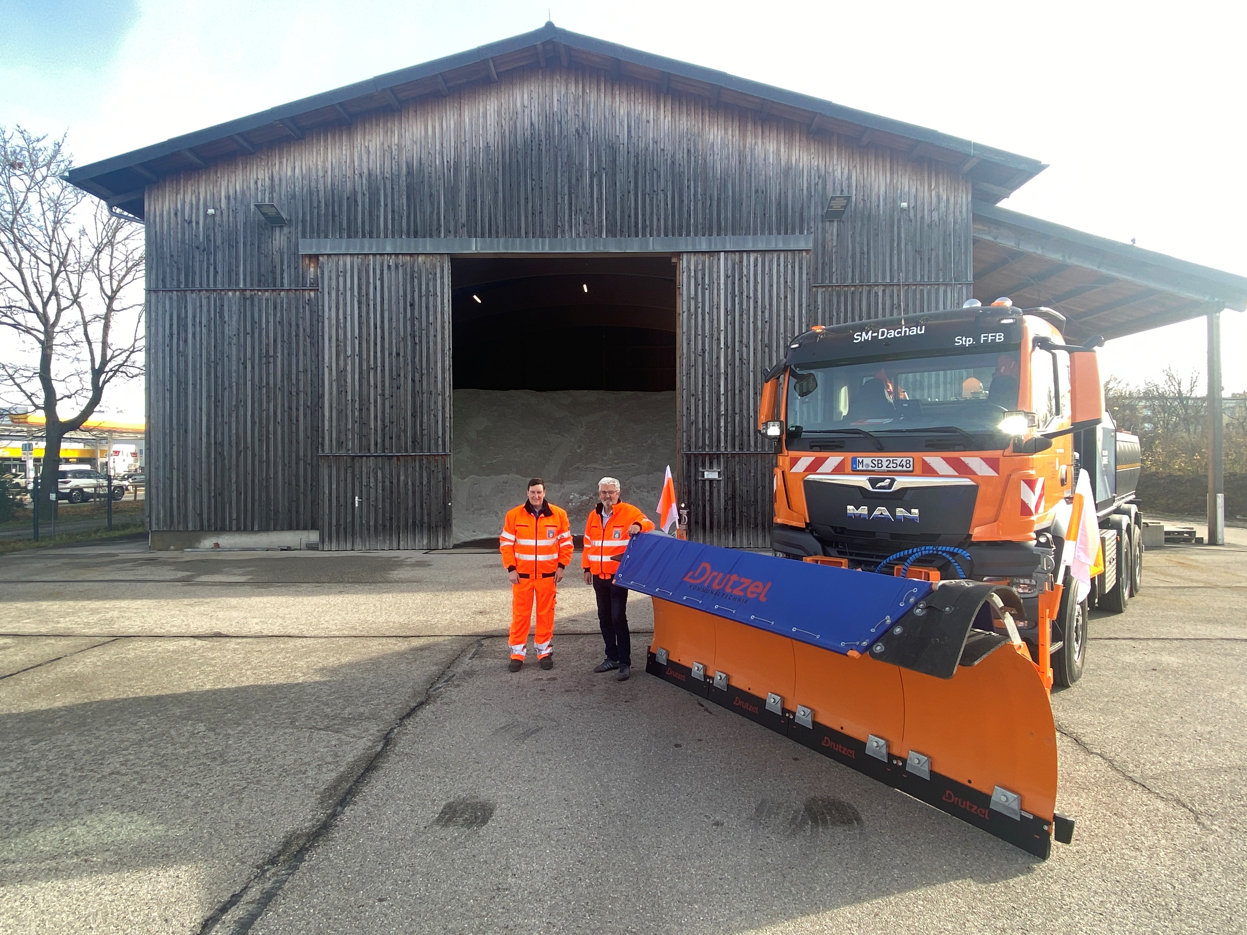 Bildunterschrift: Die Teams der Straßenmeistereien des Staatlichen Bauamtes Freising sind gerüstet für den bevorstehenden Winter. Robert Huber (Winterdienstfahrer) und Michael Hindahl (Dienststellenleiter) von der Straßenmeisterei Dachau (v.l.n.r.).