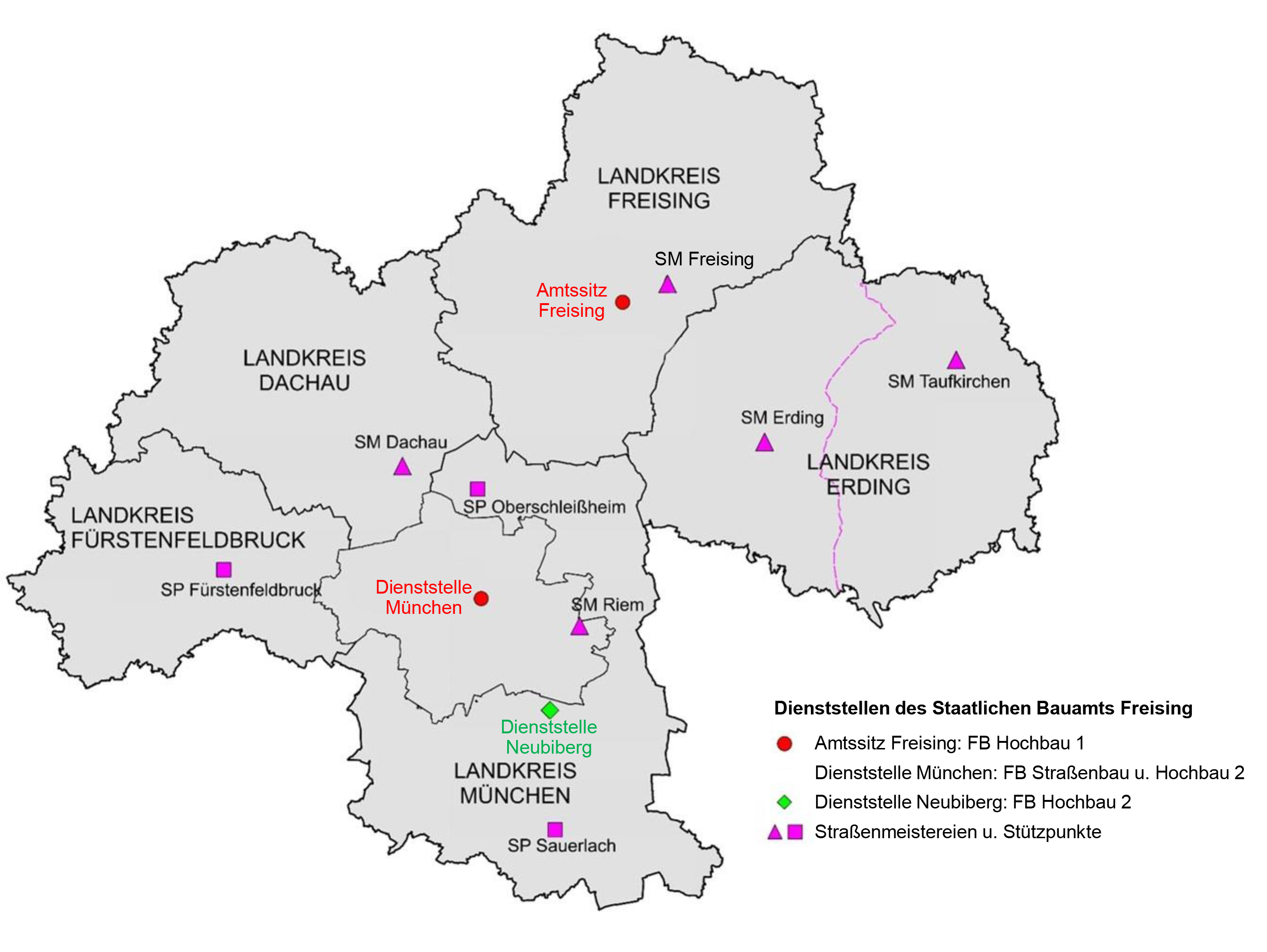Das Staatliche Bauamt Freising betreut in den Landkreisen München, Dachau, Erding, Freising und Fürstenfeldbruck Hochbau-Liegenschaften des Landes, des Bundes, der Bundeswehr und teilweise auch der Kirche. Zudem sind wir im Straßenbau für die überörtliche Straßeninfrastruktur zuständig. Unser Amtssitz ist in Freising, darüber hinaus gibt es die Servicestelle in München, die Außenstelle in Neubiberg sowie die Straßenmeistereien in den Landkreisen.